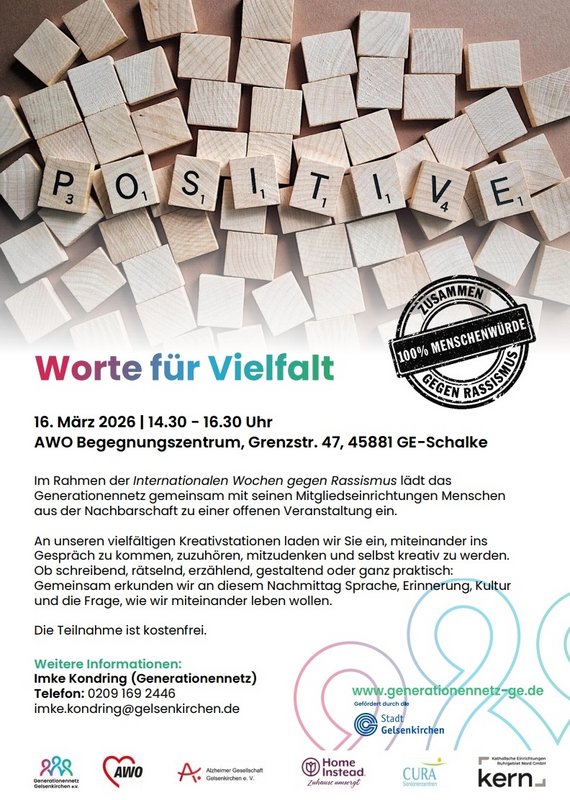 Begegnung, Austausch und kreative Impulse für ein starkes Miteinander Im Rahmen der Internationalen Wochen gegen Rassismus lädt das Generationennetz gemeinsam mit seinen Mitgliedseinrichtungen (AWO UB GE/BOT, AWO Westliches Westfalen, RuhrpottPflege (Home Instead), KERN Pflegeheime (St. Josef & St. Hedwig), Alzheimer Gesellschaft Gelsenkirchen, Cura Seniorencentren) zu zwei offenen Veranstaltungen unter dem Titel „Worte für Vielfalt“ ein. Ziel ist, Menschen aus der Nachbarschaft zusammenzubringen und einen Raum für Austausch, Begegnung und kreatives Mitmachen zu schaffen. Im Mittelpunkt stehen Themen wie Sprache, Erinnerung, Kultur und ein respektvolles Miteinander. Die erste Veranstaltung findet am Montag, 16. März 2026, von 14.30 bis 16.30 Uhr im AWO-Begegnungszentrum, Grenzstraße 47, in Gelsenkirchen-Schalke statt. Der zweite Termin wird am Mittwoch, 25. März 2026, von 15.00 bis 17.00 Uhr in der AWO, Paulstraße 4, in Gelsenkirchen-Bismarck angeboten. An vielfältigen Kreativstationen können Besucherinnen und Besucher schreibend, rätselnd, erzählend, gestaltend oder ganz praktisch aktiv werden. Die Nachmittage bieten Raum zum Zuhören, Mitdenken und Mitmachen – generationenübergreifend, offen und niedrigschwellig